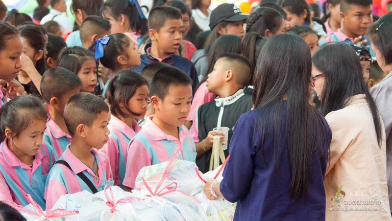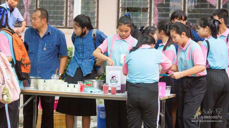 ผู้ใหญ่ใจดีนำเครื่องดื่มมาแจกให้กับเด็กได้ดื่มกัน |