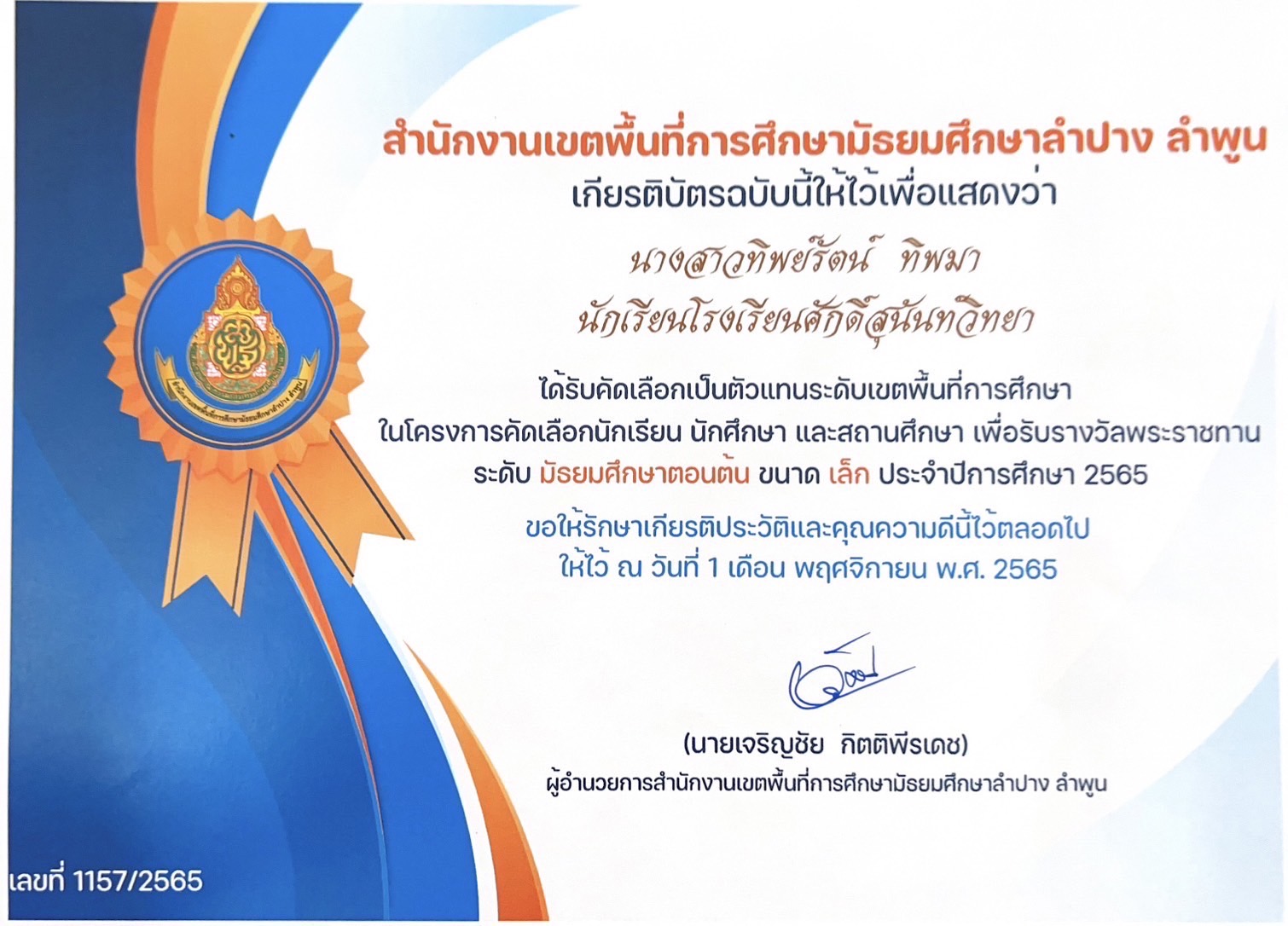 | โรงเรียนศักดิ์สุนันท์วิทยา โดยท่านพระครูโสภณสาธุกิจ ผู้รับใบอนุญาต และพระครูนิวิฐสุทธิการ ผู้จัดการและผู้อำนวยการ ขอแสดงความยินดีกับ นางสาวทิพย์รัตน์ ทิพมา นักเรียนชั้นมัธยมศึกษาปีที่ 3 ที่ได้รับคัดเลือกเป็นตัวแทนระดับเขต สพม. 35 เพื่อเข้ารับรางวัลพระราชทาน ระดับประจำปี 2565 |